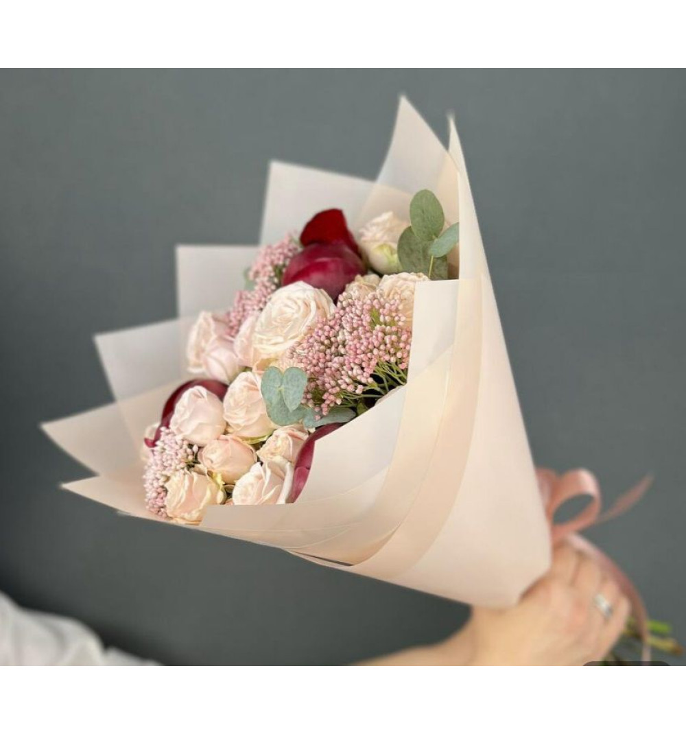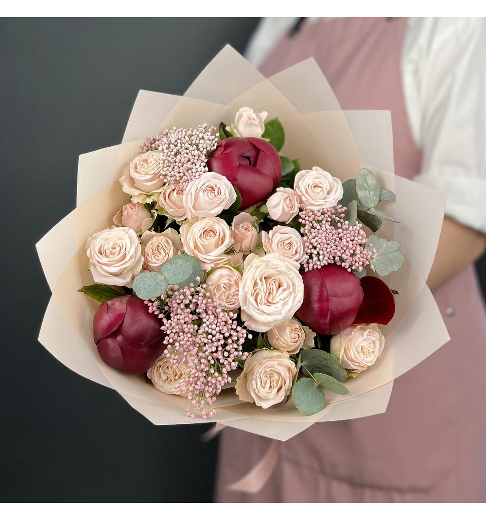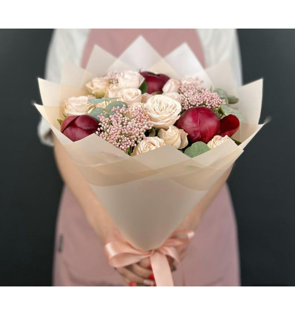 Купить Авторский букет из красных Пионов и кремовых кустовых Роз с Озотамнусом в Жетысае за 20 000 ₸ | интернет-магазин «Guls»